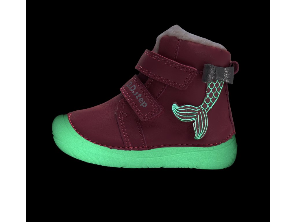 Zimní barefoot boty značky D.D.Step jsou ideální volbou pro děti, které potřebují pohodlnou, teplou a zároveň zdravou obuv podporující přirozený vývoj chodidel. Model W073-52684 spojuje kvalitní zpracování, přírodní materiály a moderní design vhodný do chladného počasí. Fosforeskující podrážka i obrázek ocasu mořské panny (svítí ve tmě).